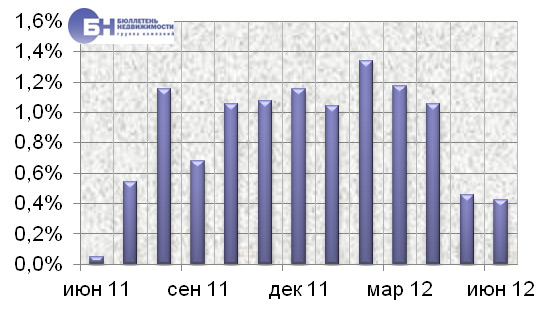 На конец июня суммарная площадь выставленных на продажу квартир составила 1 313 тыс. кв. м. В данном объеме преобладали трехкомнатные и двухкомнатные квартиры и составили 493 тыс. кв. м и 338 тыс. кв. м жилья соответственно. В структуре предложения на вторичном рынке квартир по-прежнему преобладают однокомнатные, двухкомнатные и трехкомнатные квартиры, что занимает практически 88% рынка, многокомнатные (от четырех и более комнат) составляют в среднем 12% от общего объема. В предложении с разбивкой по типу дома преобладают в большей степени кирпичные и кирпично-монолитные дома, в сумме их доля равна 41,8%. Также наибольший объем в структуре предложения занимают панельные дома старой постройки – 22,6% от всего рынка. Меньший процент приходится на квартиры в домах сталинской постройки, а также панельные дома современной постройки. Структура предложения по районам на вторичном рынке квартир в общем объеме остается практически неизменной. Лидирующие позиции занимают Приморский и Центральный районы Петербурга, составляющие 14,6% и 11,2% от всего объема рынка вторичных квартир. А также Выборгский и Невский, их доля составляет 10,5% и 8,6% соответственно. В среднем по вторичному рынку цена предложения на однокомнатные квартиры повысилась за минувший месяц на 0,1%, на двухкомнатные – на 0,5%. Трехкомнатные квартиры показали изменение на 0,5%. Средние цены предложения на конец июня 2012 года составили на однокомнатные квартиры 3,8 млн руб., на двухкомнатные квартиры 5,4 млн руб., на трехкомнатные – 7,6 млн руб. Самыми дорогими по стоимости квадратного метра по-прежнему являются однокомнатные квартиры в домах старого фонда с капитальным ремонтом – 112,7 тыс. руб. за кв. м (в среднем 5 млн руб. за квартиру), без капитального ремонта – 103,3 тыс. руб. за кв. м (в целом это 4,5 млн руб. за объект). Самыми дешевыми вариантами остаются трехкомнатные квартиры, группы домов «старая панель», на конец июня 2012 года средняя цена предложения составила 77,1 тыс. руб. за кв. м (4,8 млн руб. за квартиру). Самое дорогое жилье предлагается в центральных районах города (Центральном, Петроградском, Василеостровском, Адмиралтейском и Московском). Средняя цена «квадрата» типового жилья в этих районах от 89,4 до 130,4 тыс. руб. Самые дешевые квартиры в Красносельском, Красногвардейском и Невском районах Петербурга, «метр» жилья в них стоит в среднем от 72,2 тыс. руб., в зависимости от типа квартиры и типа дома. Наиболее популярными у покупателей являются Выборгский, Московский и Приморский районы, в сумме они составляют 30,2% от всех запросов. Также наибольшим спросом пользуются квартиры в Калининском, Кировском, Невском и Фрунзенском районах Петербурга, доля каждого района – от 8% до 9 % от общего числа запросов по поиску жилья. 12/07